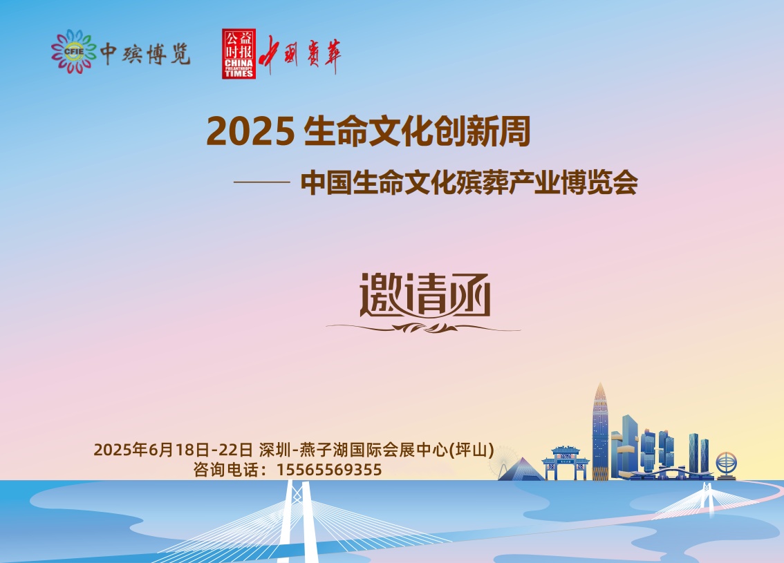 由《公益时报》社中国殡葬专刊主办 2025中国生命文化创新周 中国生命文化殡葬产业博览会(深圳) 将于2025年6月18日-19日(中国生命文化创新周) 20日-22日(中国生命文化殡葬产业博览会) 在深圳燕子湖国际会展中心(坪山)举办 参观人员:民政部领导(部长)国内外殡葬行业协会、公益时报(主任,会长,秘书长,)全国各地殡仪馆(馆长,负责人)全国各地墓园(园长)等